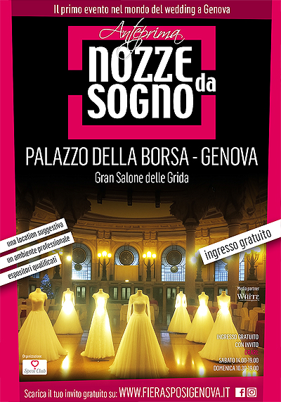 Sulla base di questa pluriennale esperienza nasce NOZZE DA SOGNO a Genova: due giorni dedicati al mondo delle nozze per comunicare il fascino di quello che ruota intorno all’universo del matrimonio, con l’eleganza e la professionalità che storicamente questo settore ha avuto nell’immaginario collettivo.